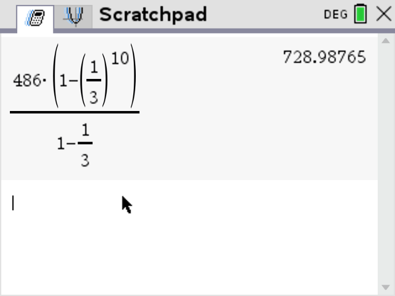 Furthermore, we're given this sequences's first term \(u_1 = 8\). Consequently we can use the infinite sum formula to write: \[S_{\infty} = \frac{u_1}{1-r}\] Now replacing \(u_1\) by \(8\) and \(S_{\infty}\) by \(20\) we obtain an equation for the unknown common ratio \(r\): \[20 = \frac{8}{1-r}\] To find \(r\) we start by getting away from the denominator, which we do by multiplying both sides of this equation by \(\begin{pmatrix}1-r \end{pmatrix}\): \[20\begin{pmatrix}1-r \end{pmatrix} = 8\] Now that \(r\) is away from the numerator, we can solve the usual way: \[\begin{aligned} & 20 - 20r = 8 \\ & -20r = 8-20 \\ & -20r = -12 \\ & r = \frac{-12}{-20} \\ & r = \frac{-4 \times 3}{-4 \times 5} \\ & r = \frac{3}{5} \quad \begin{pmatrix}r = 0.6 \end{pmatrix} \end{aligned}\]