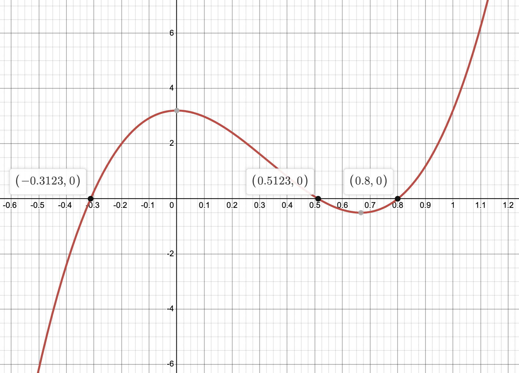 We can see that there are 3 values of x at which that happens: \[x = -0.3123, \ x = 0.5123, \ \text{and} \ x = 0.8\] Since we were told that \(r > 0.6\) the value of \(r\) we're looking for must therefore be: \[r = 0.8\]