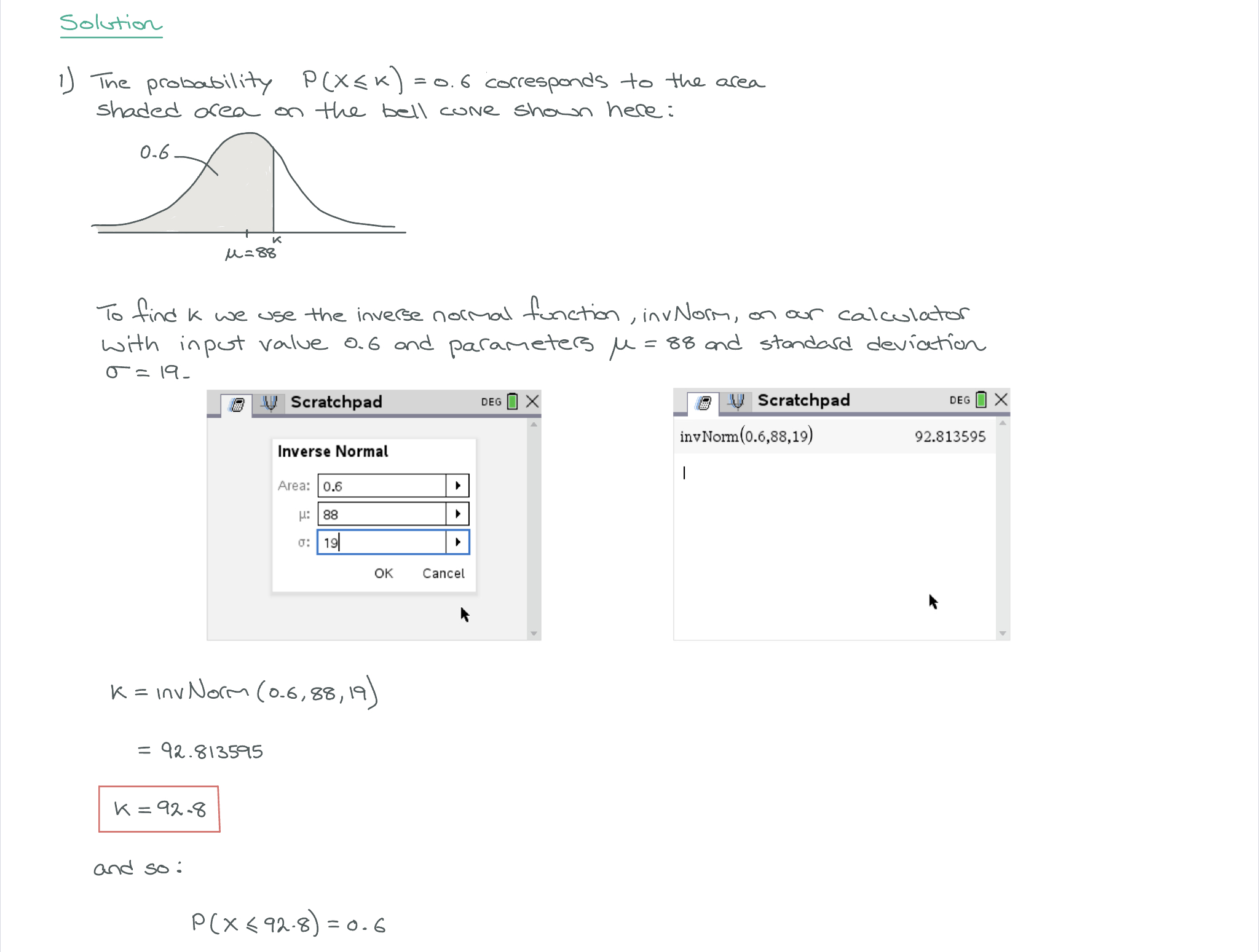So for the typical question, shown above, the inverse normal function will allow us to calculate the value \(x = k\) such that: \[P\begin{pmatrix}X \leq k \end{pmatrix} = 0.9\] We'll refer to the inverse normal function using either of the following notations: \[F^{-1}(p) \quad \text{or} \quad invNorm(p)\] Notice that the input value for the inverse normal function is a probability (an area under the bell curve) and the output value is a value of \(x\).