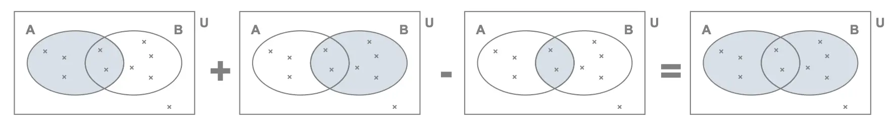 Given an experent with, the probability of A or B occurring is given by: \[p\begin{pmatrix}A \cup B\end{pmatrix} = p\begin{pmatrix}A\end{pmatrix} + p\begin{pmatrix}B \end{pmatrix} - p \begin{pmatrix}A \cap B\end{pmatrix}\]