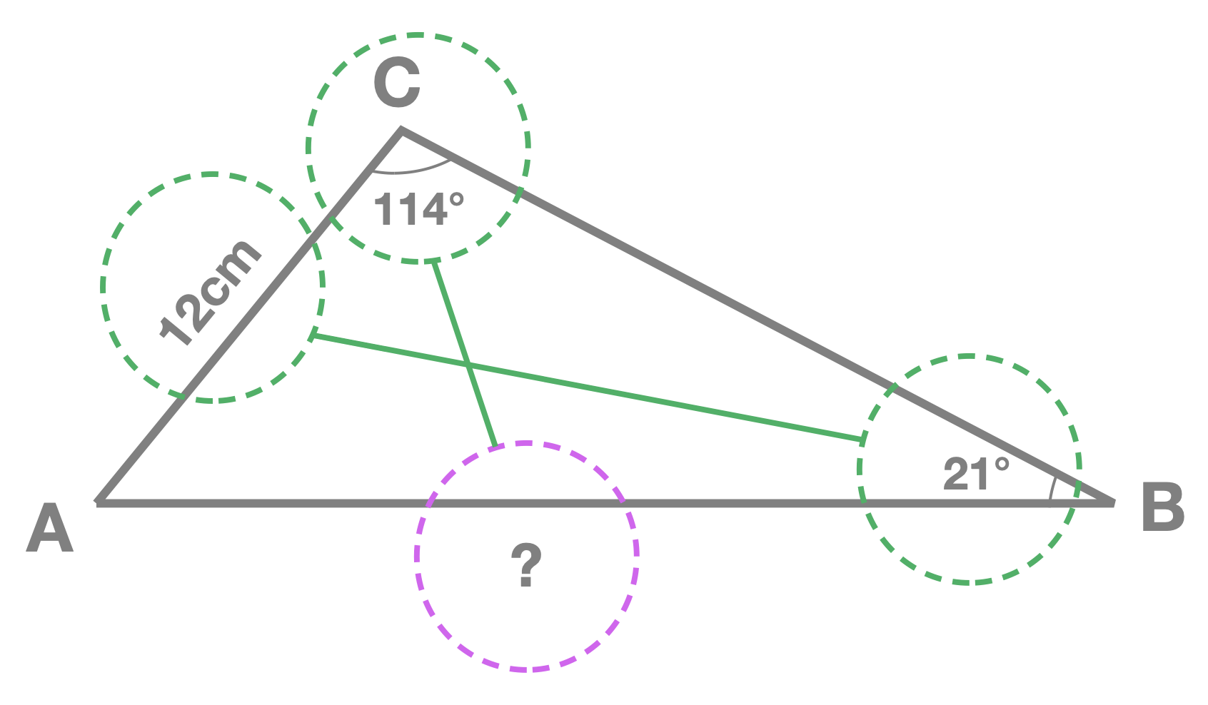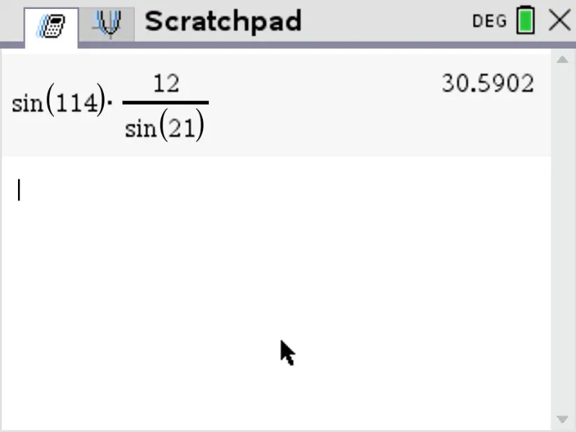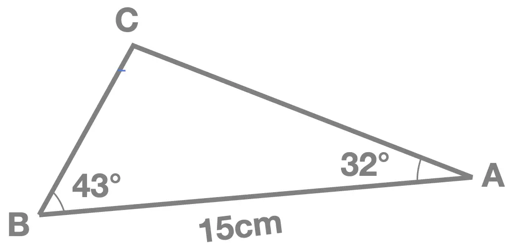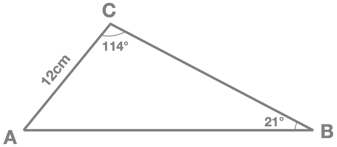 Starting from \(\frac{a}{sinA} = \frac{b}{sinB}\) we can write: \[\frac{AB}{sin\begin{pmatrix}114^{\circ} \end{pmatrix}} = \frac{12}{sin\begin{pmatrix}21^{\circ} \end{pmatrix}}\] To find \(AB\) we now multiply both sides by \(sin\begin{pmatrix}114^{\circ} \end{pmatrix} \): \[AB = sin\begin{pmatrix}114^{\circ} \end{pmatrix} \times \frac{12}{sin\begin{pmatrix}21^{\circ} \end{pmatrix}} \]