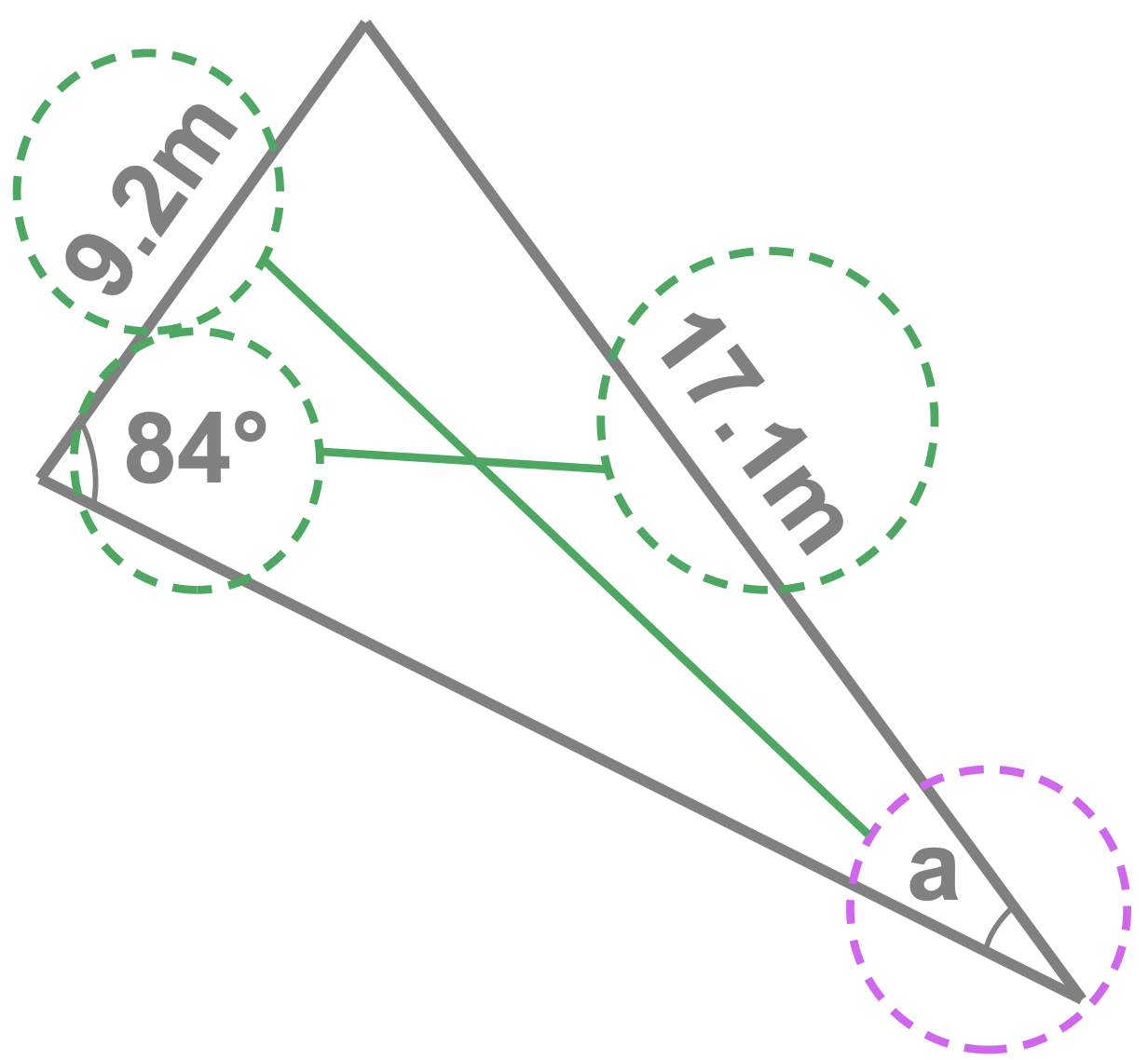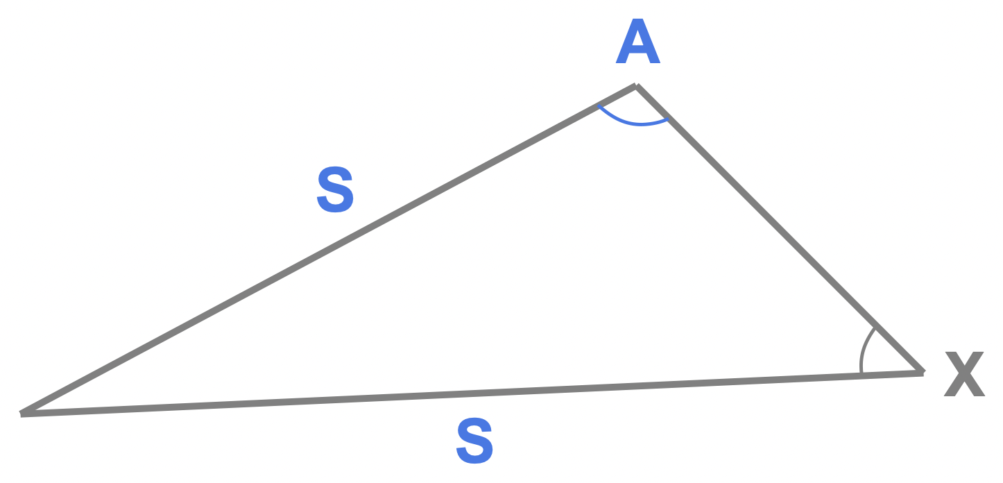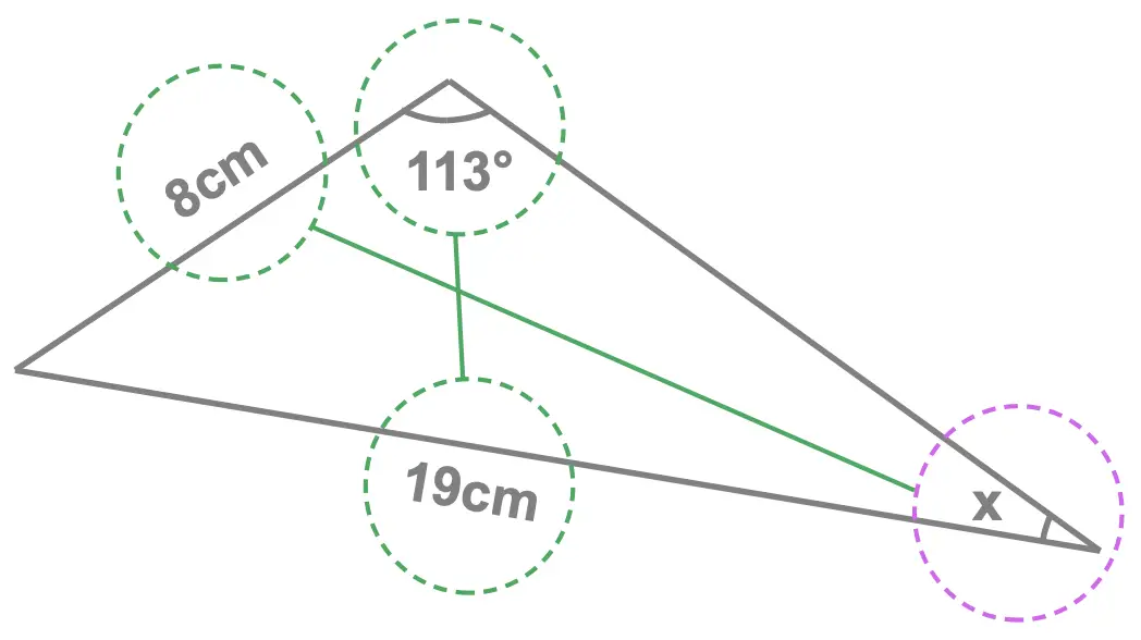 This is illustrated here where the angle and sides labelled in blue correspond to the information we have and the gray X corresponds to the angle we need to find.