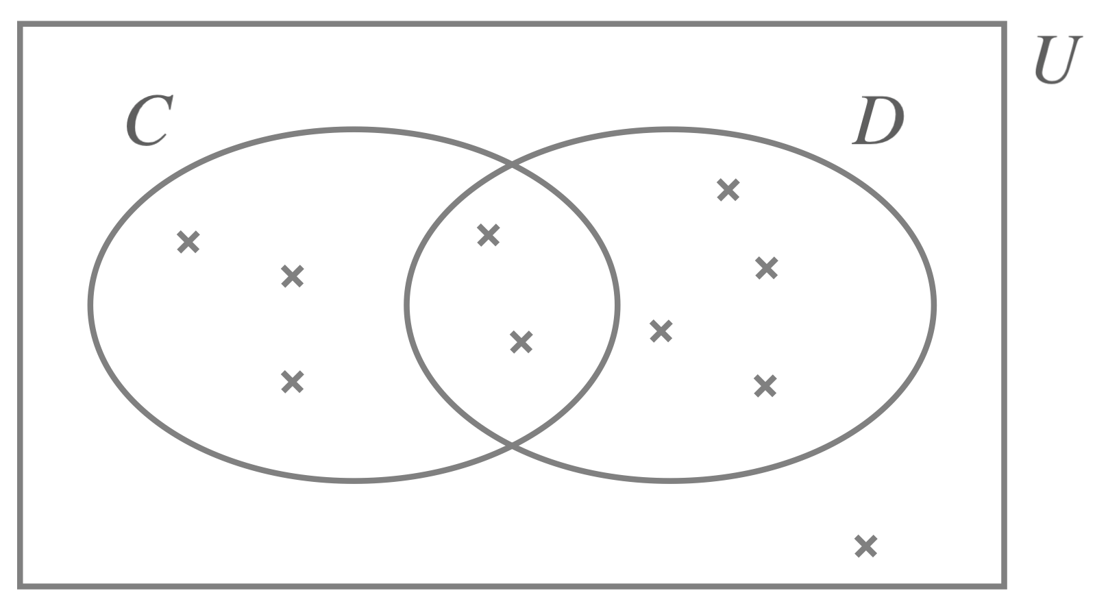 If we're given, or can find, how many elements are inside the set \(A \cap B\) and we know how many elements are inside the universal set \(U\), that's \(n\begin{pmatrix}U \end{pmatrix}\), then we can calculate \[p\begin{pmatrix}A \cap B \end{pmatrix} = \frac{n \begin{pmatrix} A \cap B \end{pmatrix}}{n \begin{pmatrix}U\end{pmatrix}}\] We frequently won't be given enough information to find both \(n\begin{pmatrix}A \cap B \end{pmatrix}\) and \(n\begin{pmatrix} U \end{pmatrix}\). Instead we'll "just" be given, or will be able to find the probabilities \(p\begin{pmatrix}A\end{pmatrix}\) and \(p\begin{pmatrix}B \end{pmatrix}\). In such cases we'll have to use the formula that we learn next.